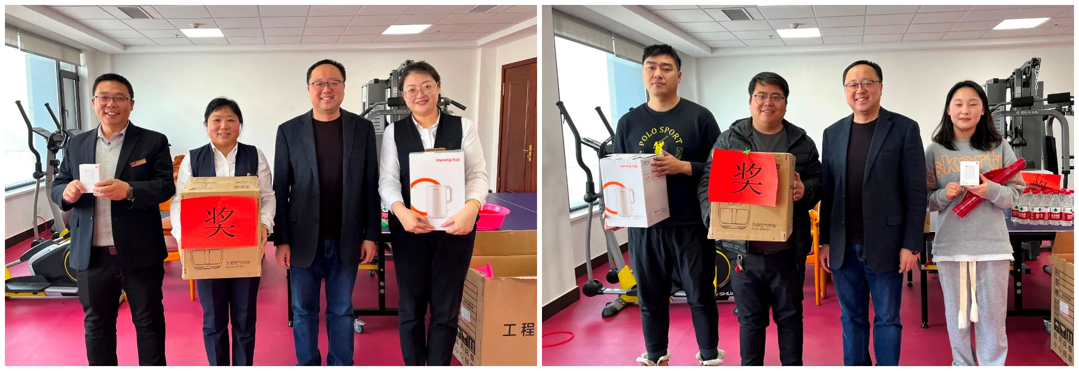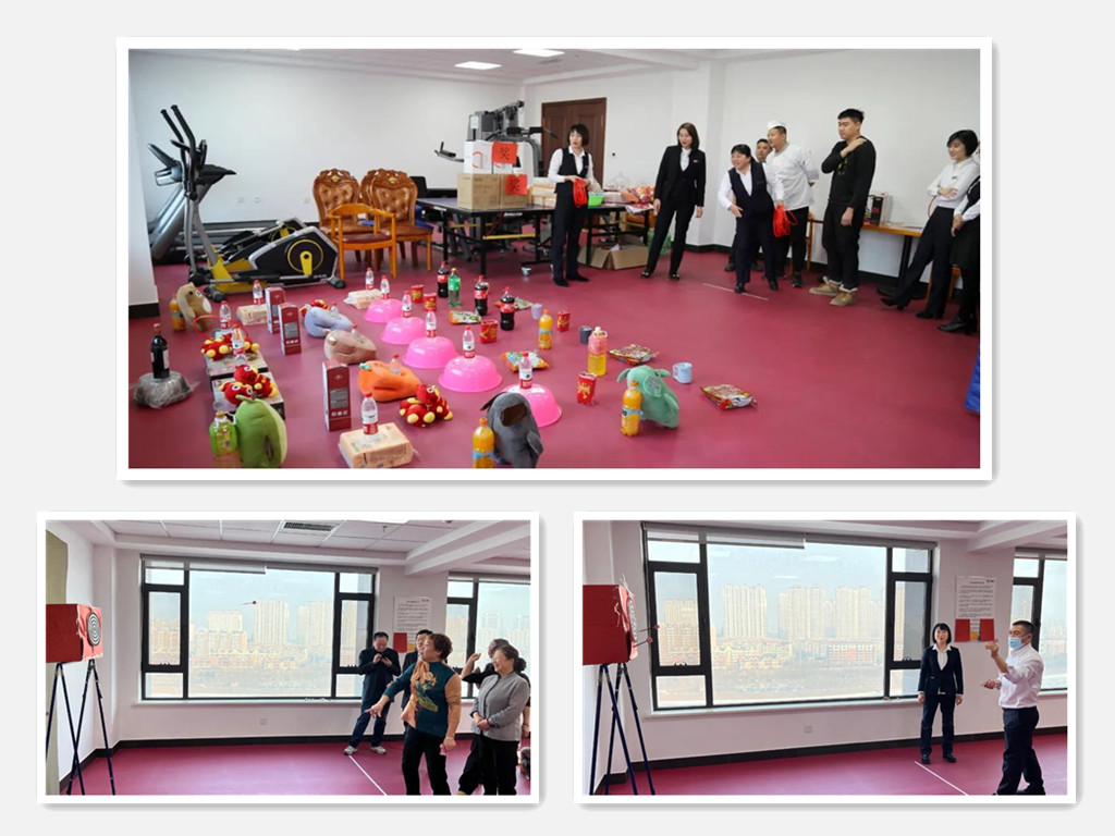 套圈活動(dòng)現(xiàn)場(chǎng),福字、春聯(lián)、飲料、保溫杯、抱枕、餐具套裝等等,還有價(jià)值2000元的紅酒,隨著一聲聲歡呼,參加活動(dòng)的同事滿臉笑容的一堆堆套走。飛鏢靶前,屏氣凝神,大家為投手吶喊助威。