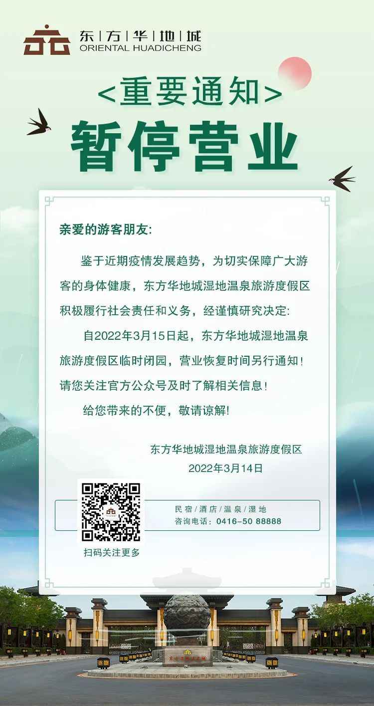 重要通知|東方華地城濕地溫泉旅游度假區(qū)暫停營(yíng)業(yè)-華地動(dòng)態(tài)-錦州華地集團(tuán)有限公司